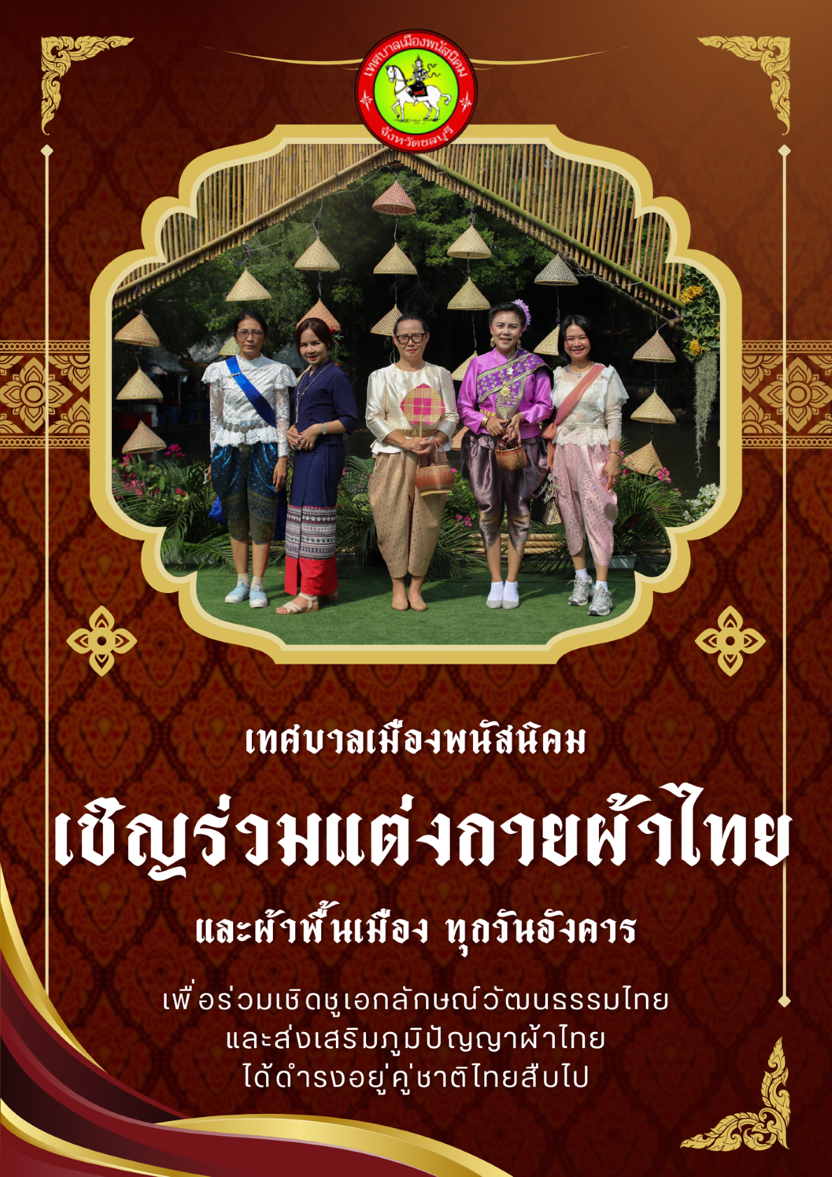 ขอเชิญชวน ประชาชนภายในเขตพื้นที่ ประชาชนทั่วไป และผู้ที่สนใจ ร่วมแต่งกายผ้าไทย ผ้าพื้นเมือง เพื่อร่วมเชิดชูเอกลักษณ์วัฒนธรรมไทยและส่งเสริมภูมิปัญญาผ้าไทย ให้ดำรงอยู่คู่ชาติไทยสืบไป
