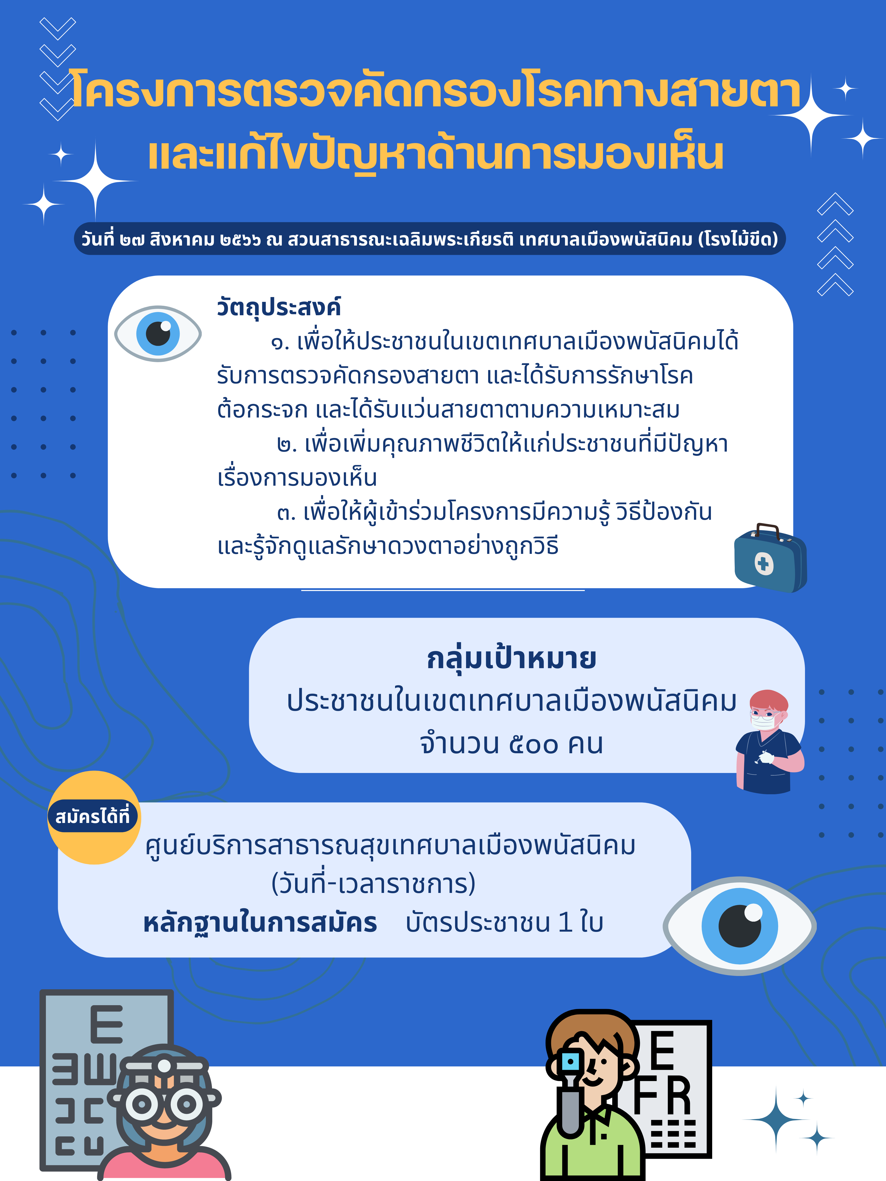 ขอเชิญประชาชนทั่วไปที่มีภูมิลำเนาอยู่ในเขตเทศบาลเมืองพนัสนิคม จำนวน 500 คน เข้าร่วมตรวจคัดกรองโรคทางสายตาและแก้ไขปัญหาด้านการมองเห็น ณ ศูนย์บริการสาธารณสุขเทศบาลเมืองพนัสนิคม ในวันและเวลาราชการ ตั้งแต่วันนี้เป็นต้นไปจนครบตามจำนวนและจะตรวจคัดกรองในวันที่ 27 สิงหาคม 2566 ณ สวนสาธารณะเฉลิมพระเกียรติเทศบาลเมืองพนัสนิคม (โรงไม้ขีด)