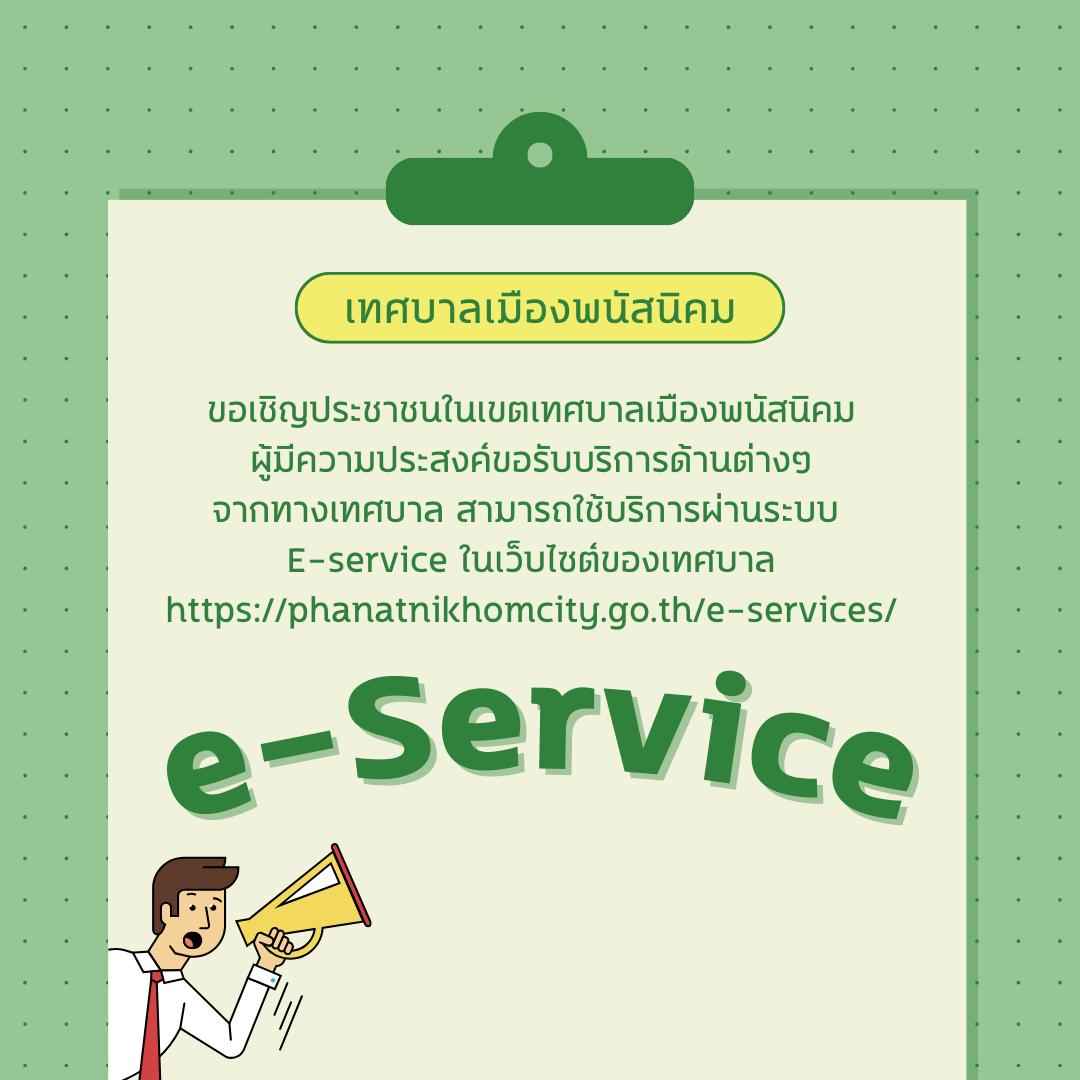 ขอเชิญประชาชนในเขตเทศบาลเมืองพนัสนิคม ผู้มีความประสงค์ขอรับบริการด้านต่างๆ จากทางเทศบาล สามารถใช้บริการผ่านระบบ E-service ในเว็บไซต์ของเทศบาล https://phanatnikhomcity.go.th/e-services/