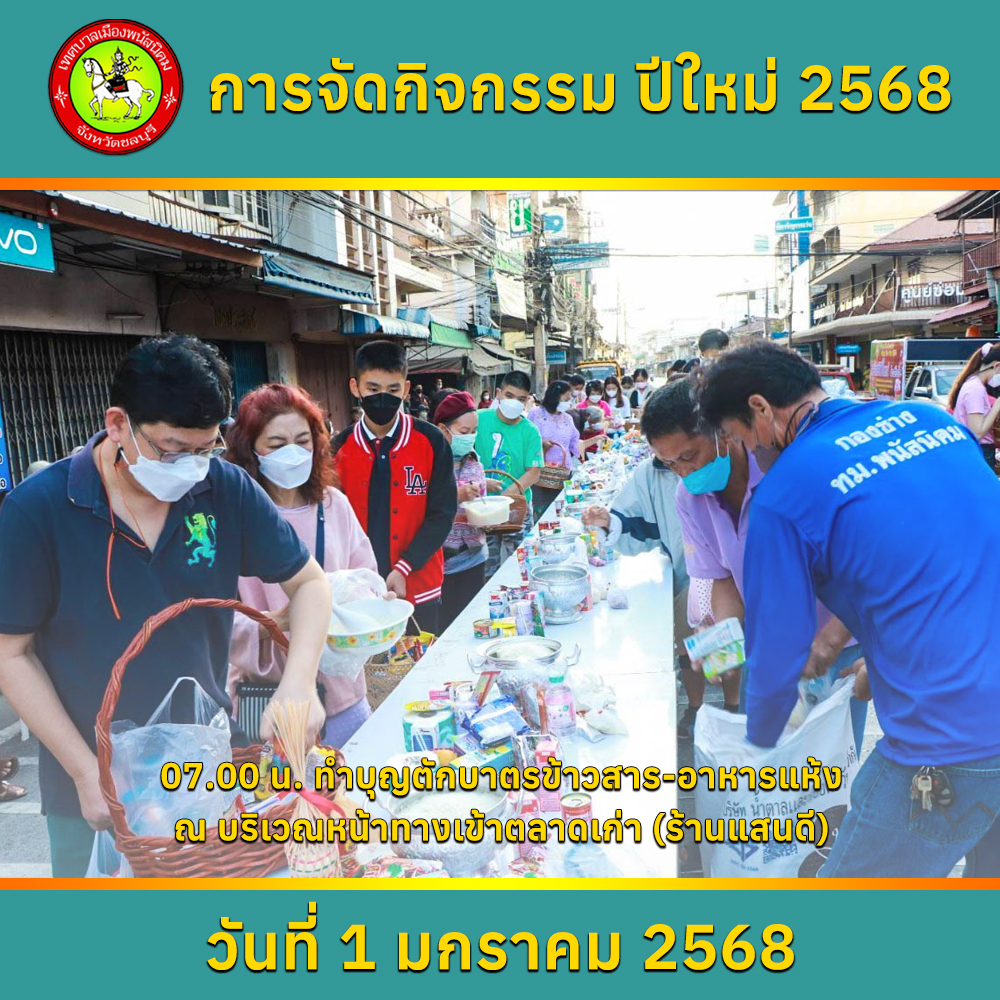 เวลา 07.00 น. ทำบุญตักบาตร ถวายภัตตาหารเช้า ณ บริเวณตลาดใหม่