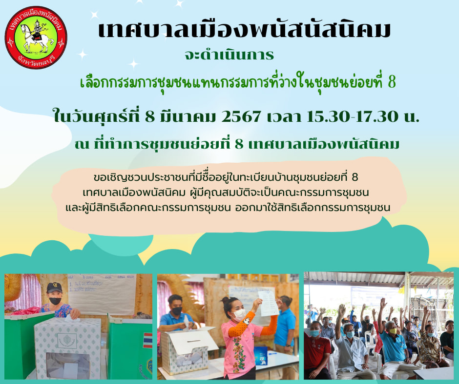 📣📣📣เทศบาลเมืองพนัสนิคม จะดำเนินการเลือกกรรมการชุมชนแทนกรรมการที่ว่างใน ชุมชนย่อยที่ 8 เทศบาลเมืองพนัสนิคม
