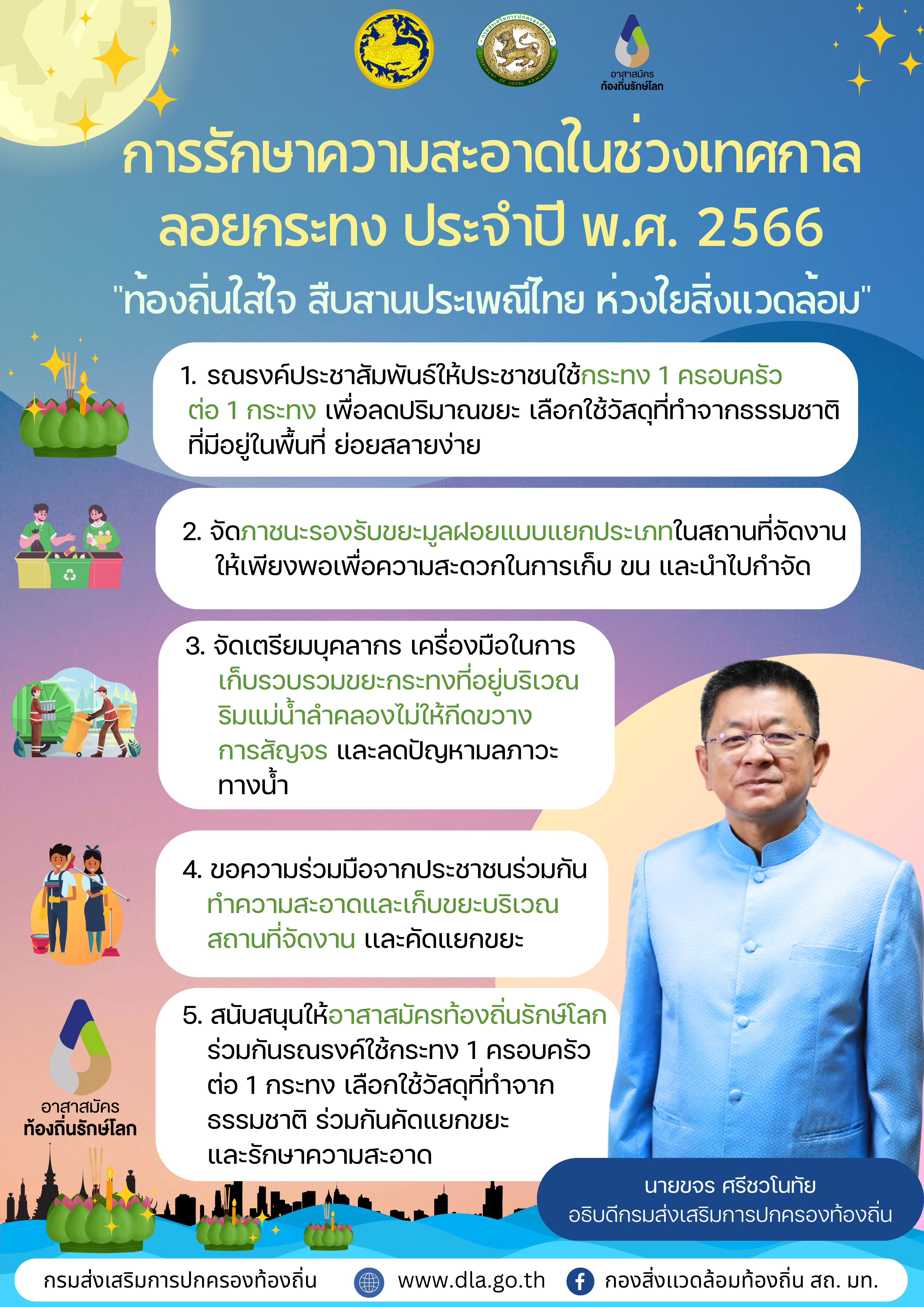 การรักษาความสะอาดในช่วงเทศกาลลอยกระทง ประจำปี พ.ศ. 2566 “ท้องถิ่นใส่ใจ สืบสานประเพณีไทย ห่วงใยสิ่งแวดล้อม”