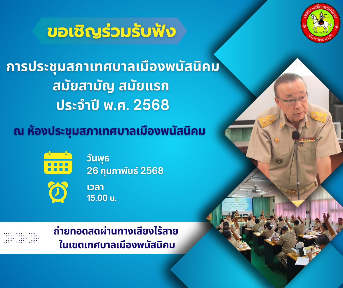 ขอเชิญผู้ที่สนใจเข้าร่วมรับฟังการประชุมสภาเทศบาลเมืองพนัสนิคม สมัยสามัญ สมัยแรก ประจำปี 2568 ในวันพุธที่ 26 กุมภาพันธ์ 2568 เวลา 15.00 น. ณ ห้องประชุมสภาเทศบาลเมืองพนัสนิคม พร้อมทั้งออกอากาศผ่านทางเสียงไร้สาย ในเขตเทศบาลเมืองพนัสนิคม