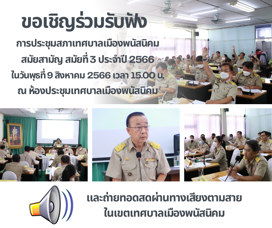 ขอเชิญร่วมรับฟัง การประชุมสภาเทศบาลเมืองพนัสนิคม สมัยสามัญ สมัยที่ 3 ประจำปี 2566