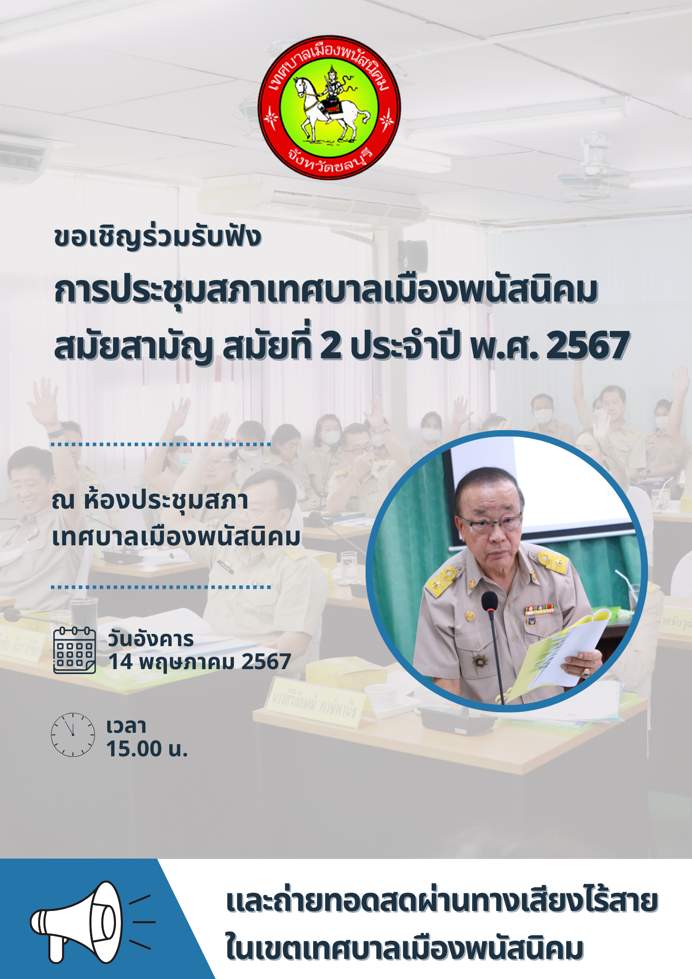 ขอเชิญร่วมรับฟัง การประชุมสภาเทศบาลเมืองพนัสนิคม สมัยสามัญ สมัยที่ 2 ประจำปี พ.ศ. 2567 . ในวันอังคารที่ 14 พฤษภาคม 2567 เวลา 15.00 น. ณ ห้องประชุมสภาเทศบาลเมืองพนัสนิคม . และถ่ายทอดสดผ่านทางเสียงไร้สาย ในเขตเทศบาลเมืองพนัสนิคม