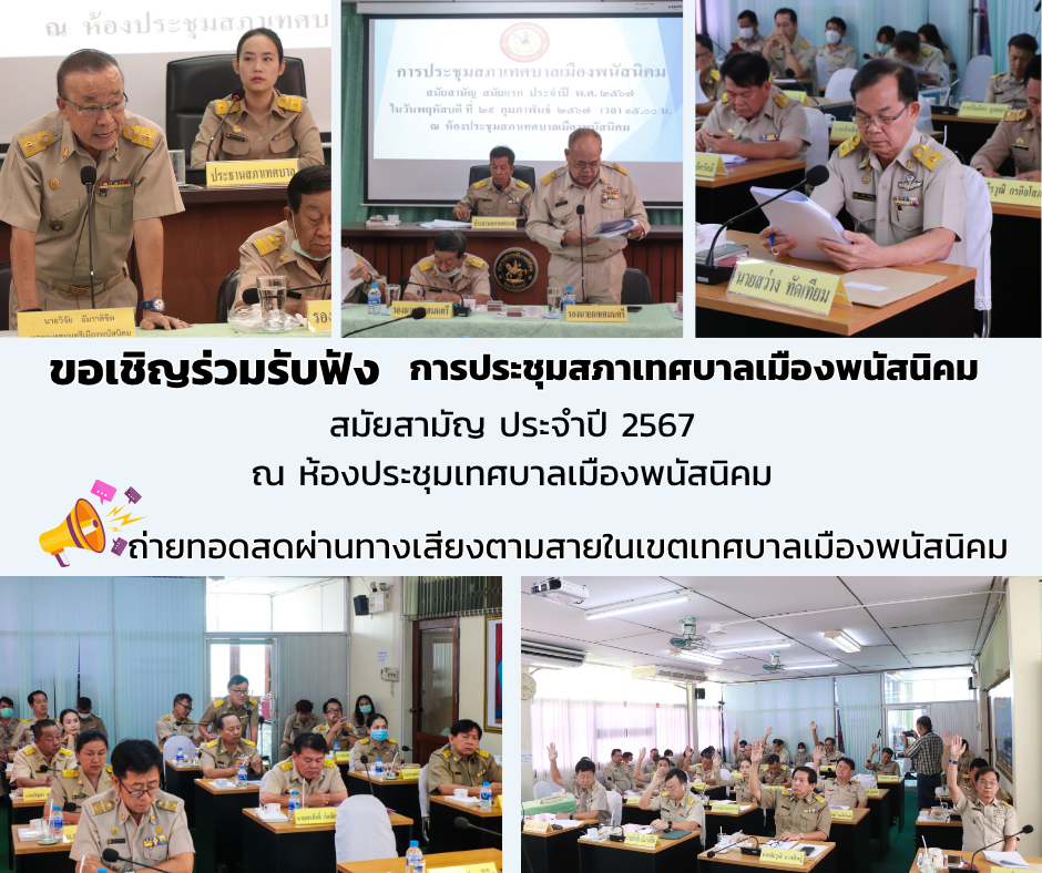 ขอเชิญร่วมรับฟัง การประชุมสภาเทศบาลเมืองพนัสนิคม สมัยสามัญ ประจำปี 2567