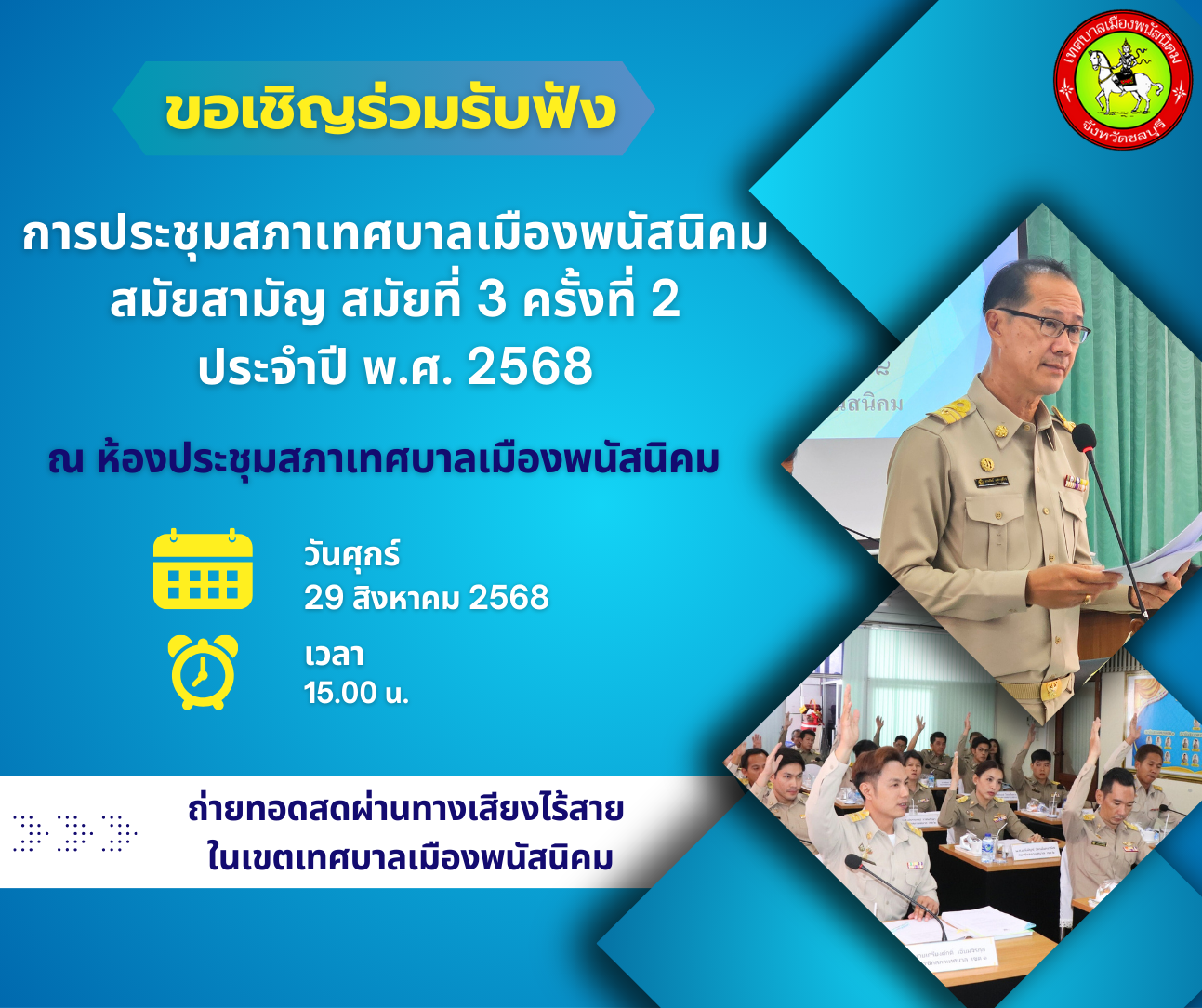 ขอเชิญร่วมรับฟัง การประชุมสภาเทศบาลเมืองพนัสนิคม สมัยสามัญ สมัยที่ 3 ครั้งที่ 2 ประจำปี พ.ศ. 2568 ในวันศุกร์ที่ 29 สิงหาคม 2568 เวลา 15.00 น.
