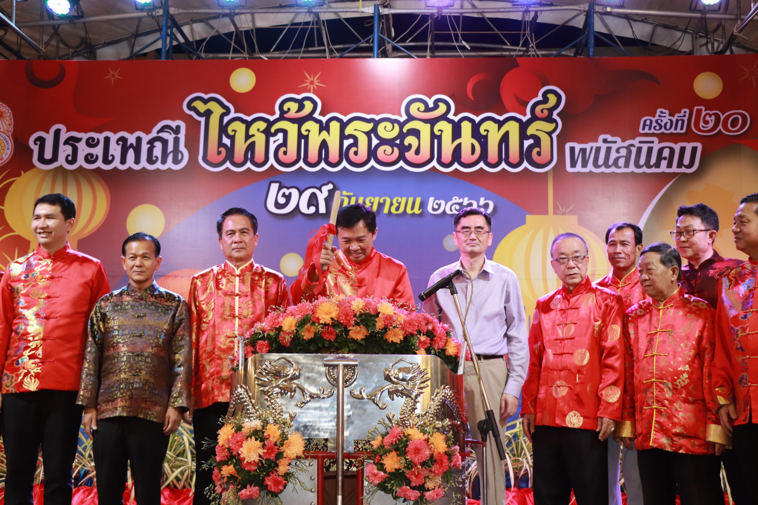 วันศุกร์ที่ 29 กันยายน 2566 ที่ผ่านมา ตั้งแต่เวลา 18.30 น. เป็นต้นไป นายวิทยาคุณปลื้ม นายกองค์การบริหารส่วนจังหวัดชลบุรี ว่าที่ร้อยตรีศราวุธ กรจิระเจริญ นายอำเภอพนัสนิคม นายเชว่ เสี่ยวหัว ผู้อำนวยการศูนย์วัฒนธรรมและการท่องเที่ยวแห่งประเทศจีน ณ กรุงเทพฯ เดินทางมาถึง หน้าร้านรัตนภัณฑ์ ถ. ศรีกุญชร พร้อมด้วยคณะผู้บริหาร สมาชิกสภาเทศบาล หัวหน้าส่วนการงาเทศบาลเมืองพนัสนิคม ร่วมพิธีตัดริบบิ้น (ซุ้มทางเข้างาน) และเข้าสู่ประรำพิธีเปิดงานประเพณีไหว้พระจันทร์ ครั้งที่ 20 ประจำปี 2566
