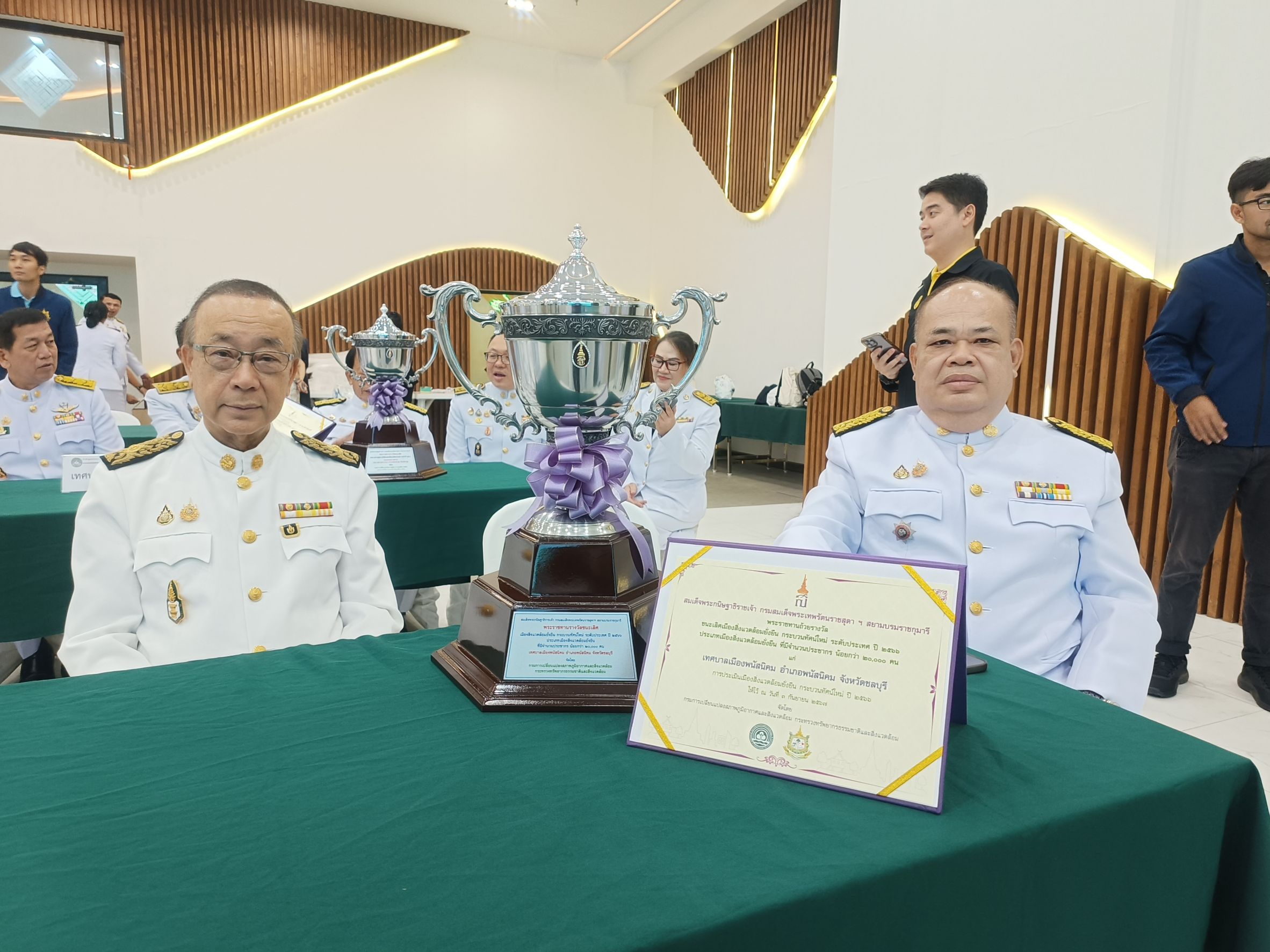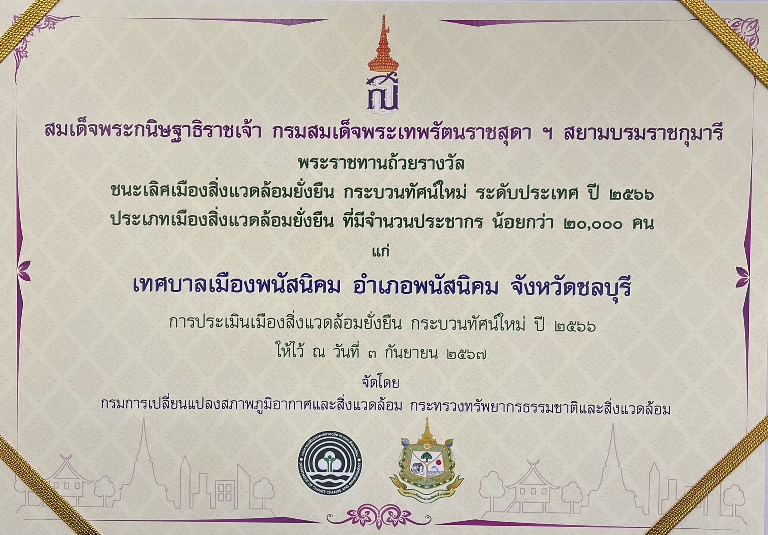 วันที่ 3 กันยายน 2567 เวลา 09.00 น. นายวิจัย อัมราลิขิต นายกเทศมนตรีเมืองพนัสนิคม พร้อมด้วยรองนายกเทศมนตรี ที่ปรึกษานายกเทศมนตรี และปลัดเทศบาล เป็นตัวแทนจากเทศบาลเมืองพนัสนิคม เข้าเฝ้าทูลละอองพระบาทสมเด็จพระกนิษฐาธิราชเจ้า กรมสมเด็จพระเทพรัตนราชสุดาฯ สยามบรมราชกุมารี รับพระราชทานถ้วยรางวัลชนะเลิศเมืองสิ่งแวดล้อมยั่งยืน กระบวนทัศน์ใหม่ ระดับประเทศ ประจำปี 2566 ประเภทเมืองสิ่งแวดล้อมยั่งยืน ที่มีจำนวนประชากร น้อยกว่า 20,000 คน ณ วังสระปทุม นับเป็นพระมหากรุณาธิคุณ และเป็นการสร้างขวัญกำลังใจต่อการมุ่งมั่นที่จะพัฒนาท้องถิ่นต่อไป
