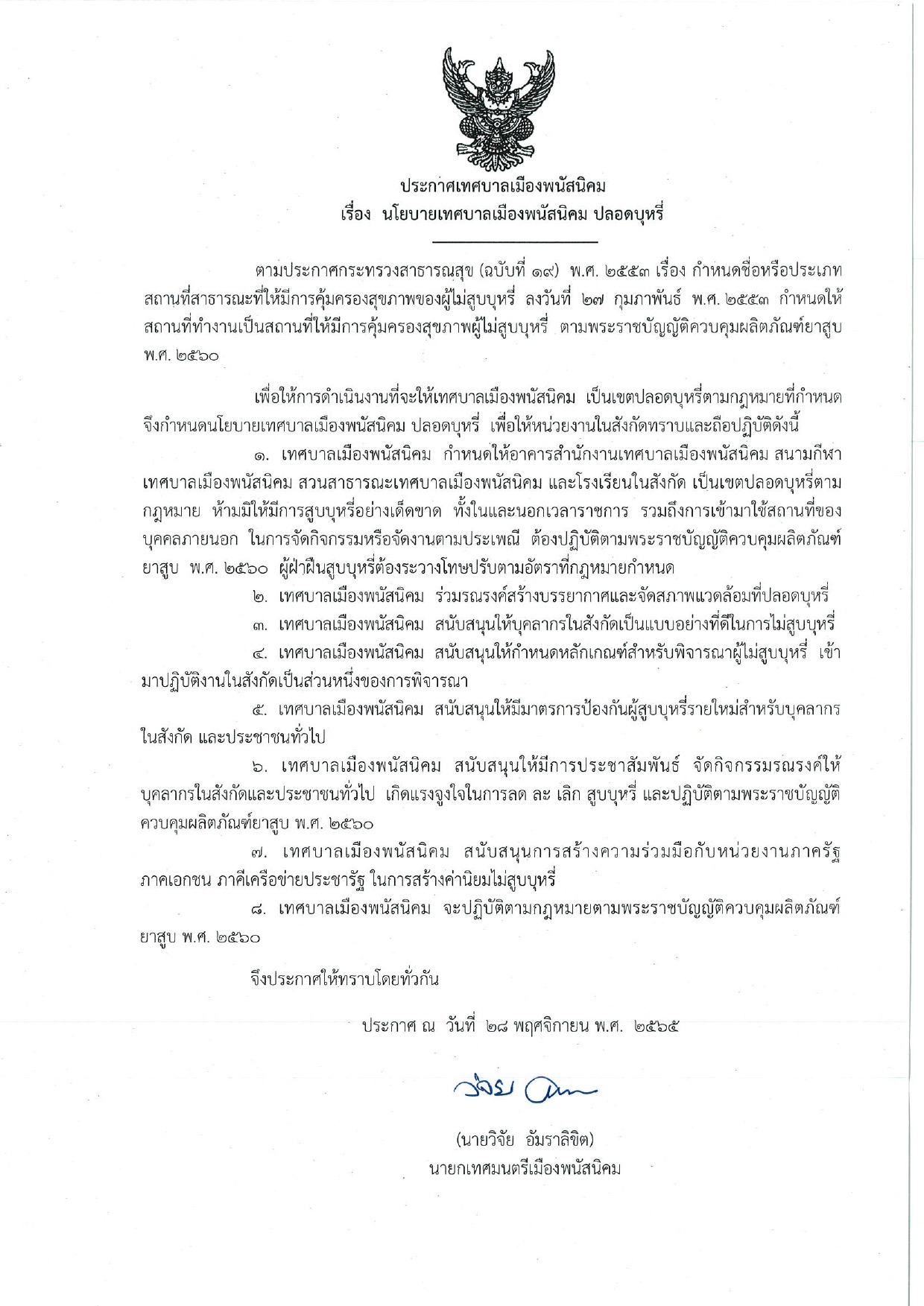 นโยบายเทศบาลเมืองพนัสนิคม ปลอดบุหรี่