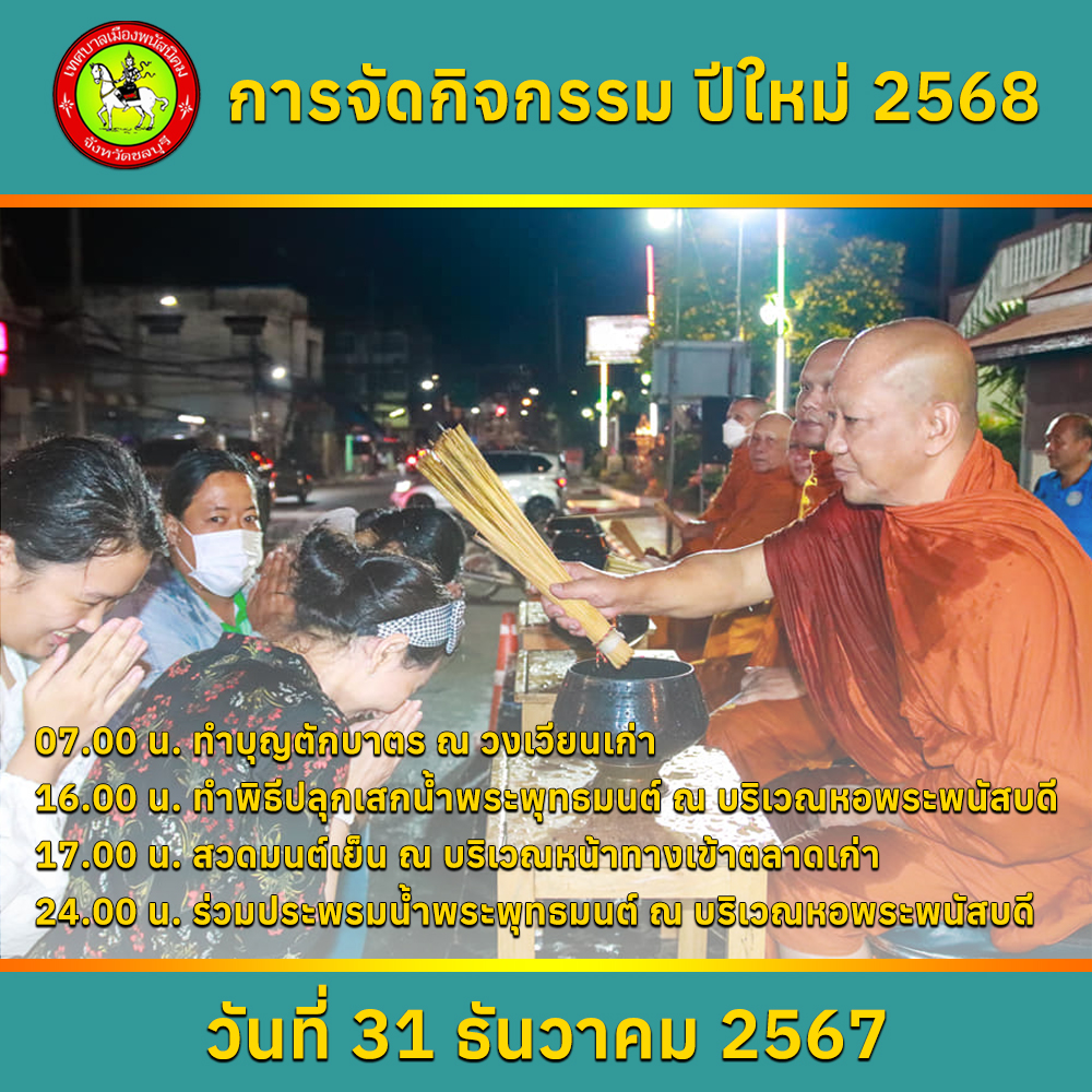 เวลา 24.00 น. ร่วมประพรมน้ำพระพุทธมนต์ ณ บริเวณหอพนัสบดี