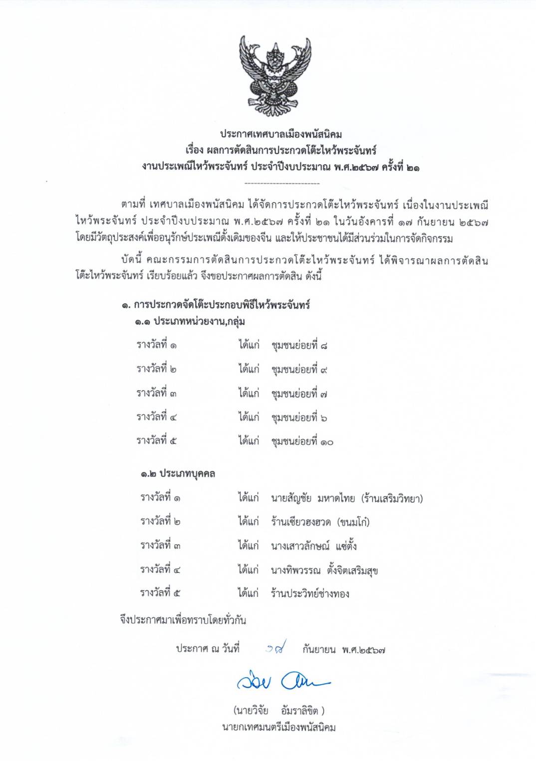 ผลการตัดสินการประกวดโต๊ะไหว้พระจันทร์ งานประเพณีไหว้พระจันทร์ ประจำปีงบประมาณ พ.ศ.2567 ครั้งที่ 21