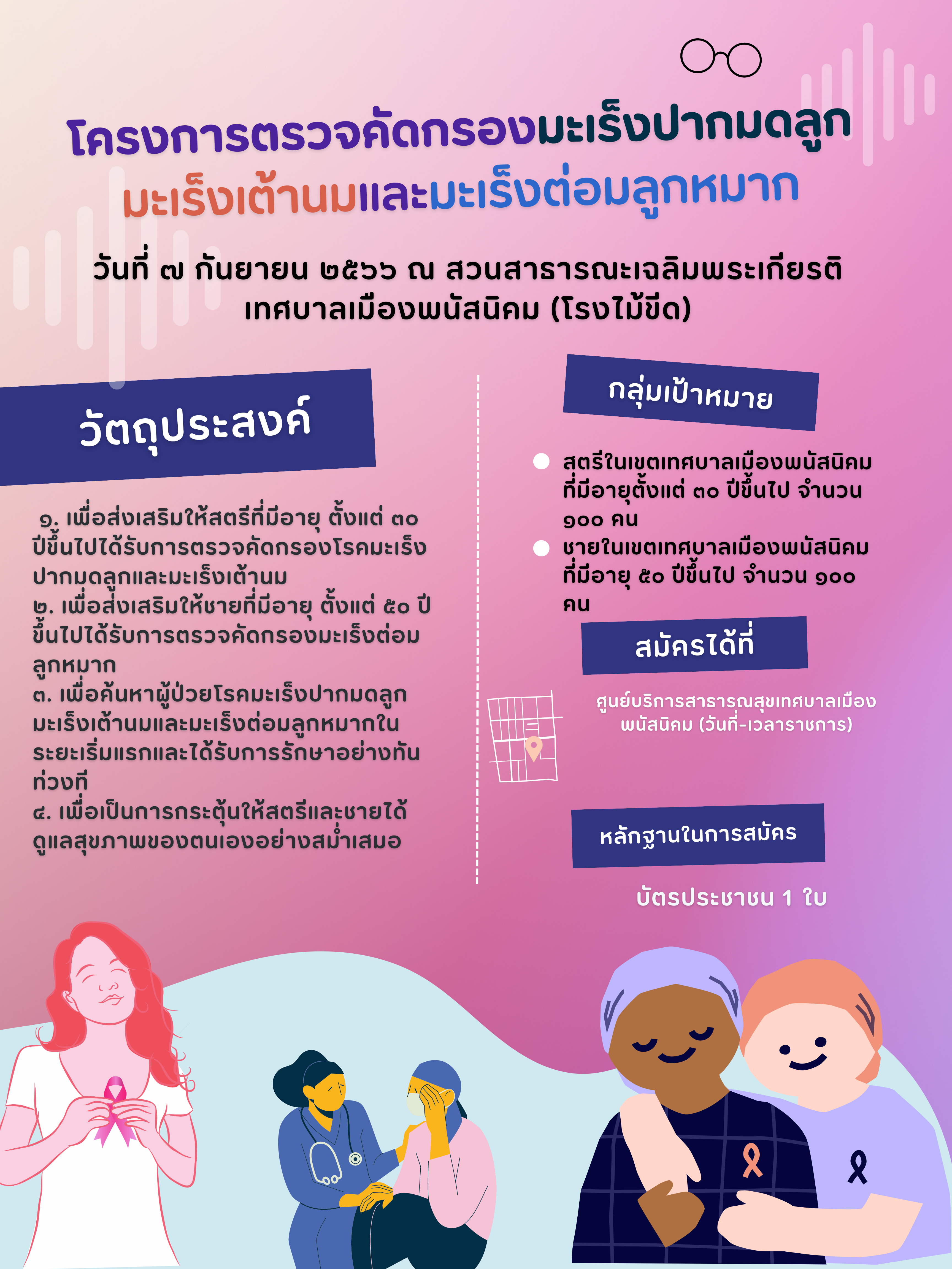 – สตรีทั่วไปที่มีอายุ 30ปีขึ้นไปและภูมิลำเนาอยู่ในเขตเทศบาลเมืองพนัสนิคม จำนวน 100 คน เข้าร่วมตรวจคัดกรองโรคมะเร็งปากมดลูกและมะเร็งเต้านม